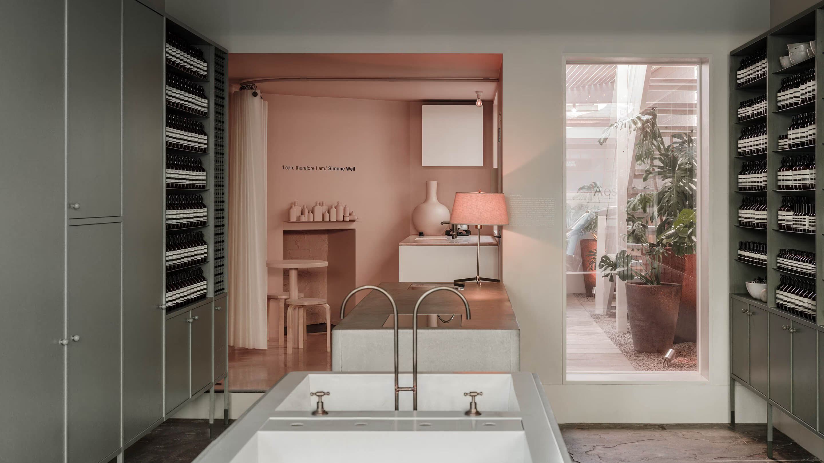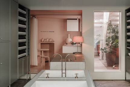 The capacious concrete demonstration sink was cast in-situ; it was inspired by laundry troughs commonly found in lean-to structures behind the area’s older houses and the premises of Fitzroy’s early farriers. At the rear of the space is a blush-pink kitchenette, which can be concealed by a translucent silicon curtain.
