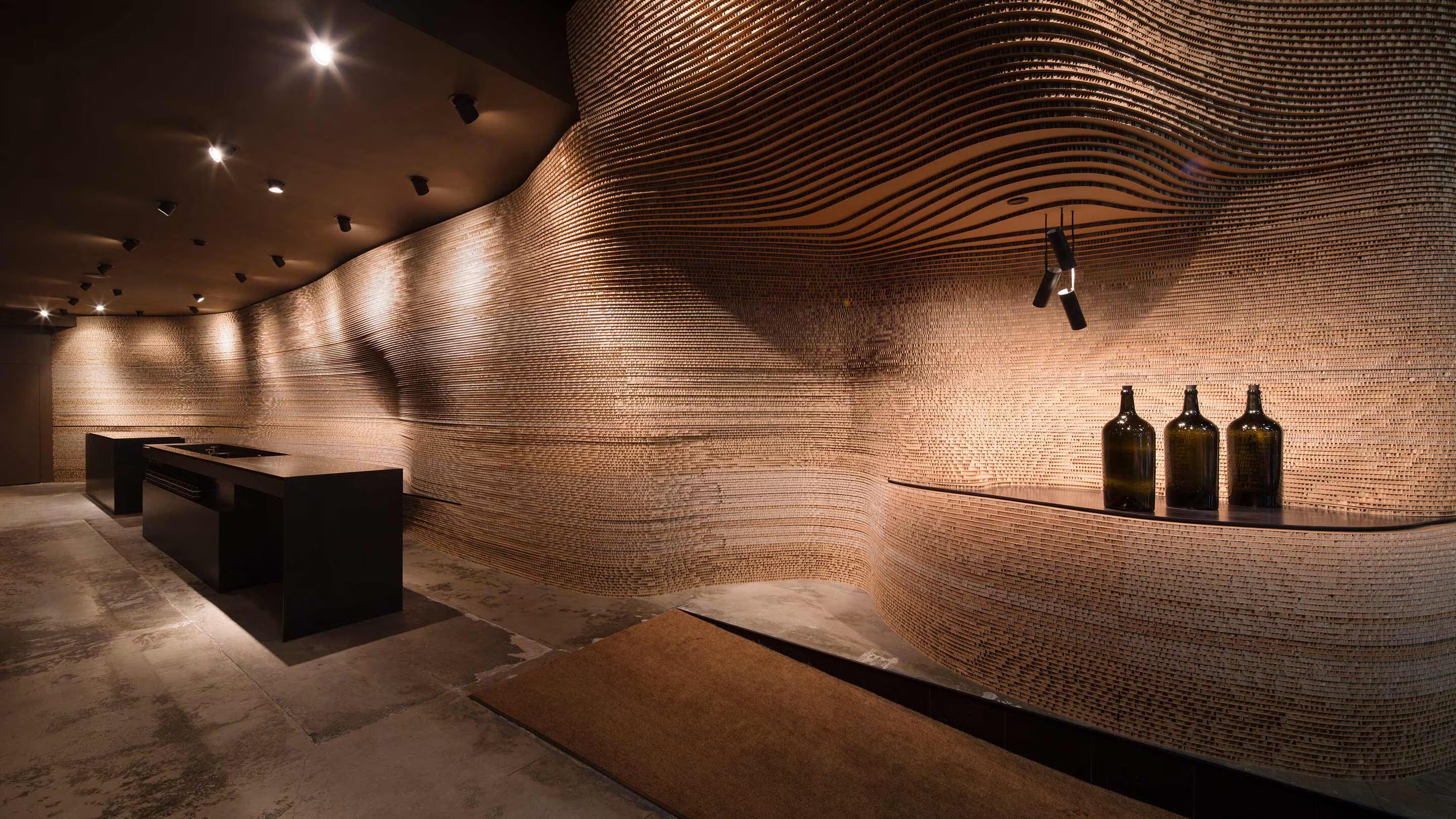 Featuring a bold feature wall created from 1,550 cardboard sheets.