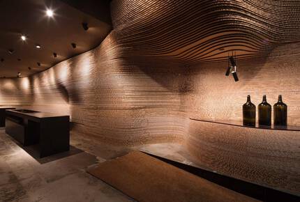 Giving fresh interpretation to the space while acknowledging its original materiality, the design features prominent use of industrial cardboard. A bold feature wall created from 1,550 cardboard sheets, modified by hand, envelops the right-hand wall—its curvature gently encouraging exploration.