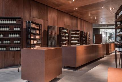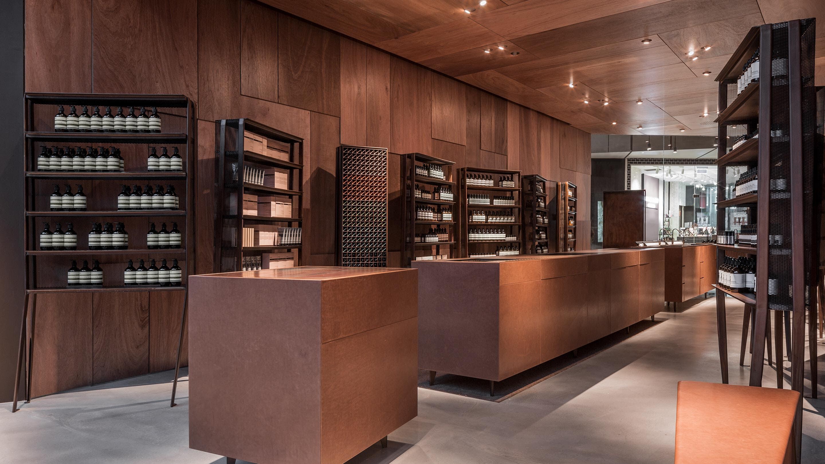 The interior effects a sense of calm and poise through an assembly of imaginary metal ‘creatures’—which furnish product display and storage—each with its own quirks, character and irregularities, which are revealed gradually as visitors make their way through. Their subtle postures contrast with the order and sturdiness of a timber, leather and concrete backdrop.