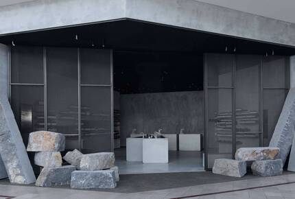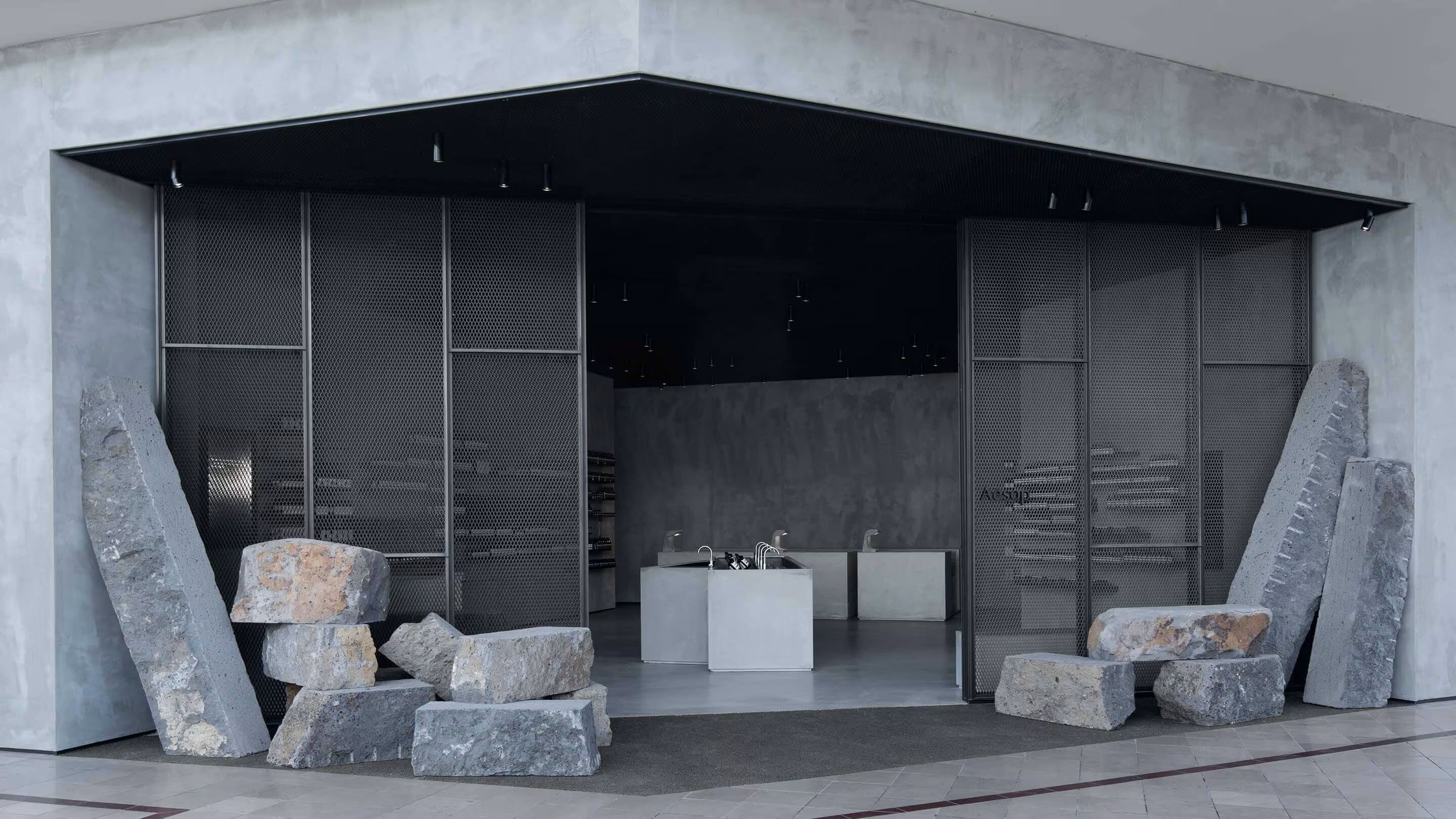 The store introduces rough-hewn minerality to the surrounding retail environment. The entrance to the corner site is flanked by monolithic discarded fragments of locally sourced Basalt.