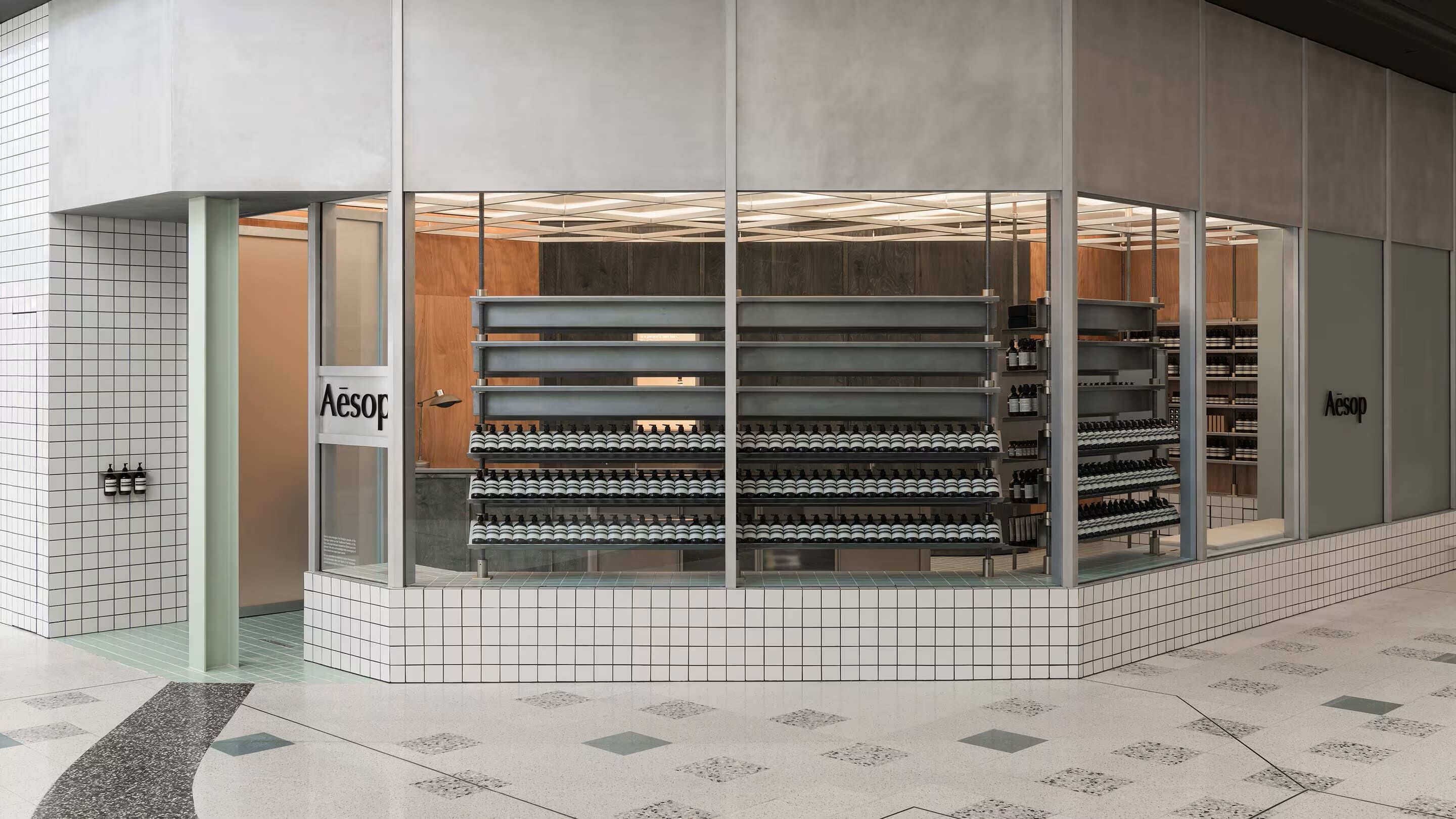 Set in a light-filled corner of Westfield Booragoon, in the southern suburb of Perth, the entirely glazed Aesop Booragoon uses materials inherited from industry to create a scenographic space—part neighbourhood boutique, part gallery. Inspired by functional modernism, the design embraces the use of modular systems suited to industrial production methods—a celebration of the poetics of the technical object.