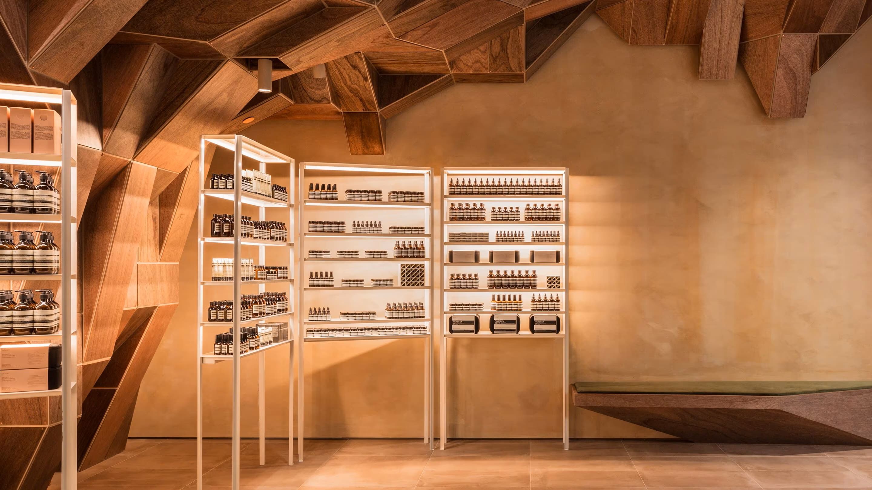 The design for this distinctive Perth store was created in partnership with Kian Yam, Mavis Yip and Kwanho Li of MLKK studio. The interior evokes a strong sense of character, defined by bold geometric shapes and a fractal sculpture that cascades from the ceiling. Crafted from plywood and assembled using multiple skeleton pieces, its faceted planes express a liveliness, creating an animated, dynamic space.