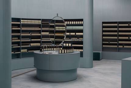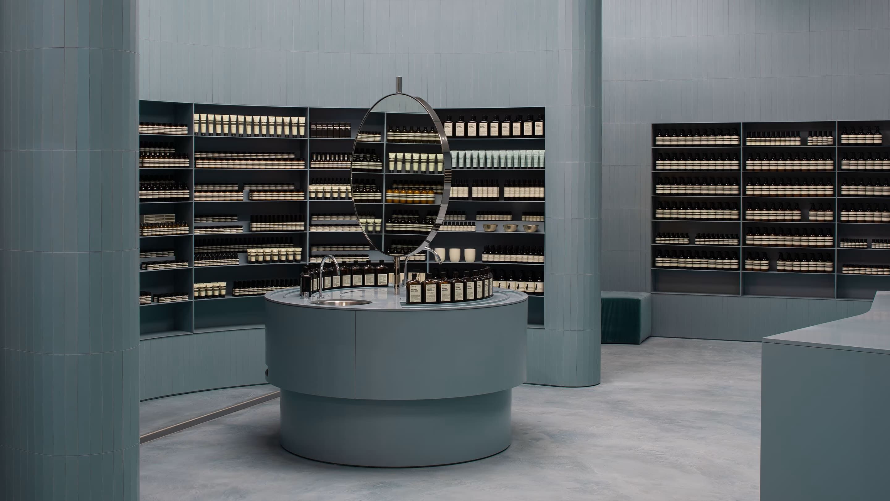 The sequence begins with a substantial semi-circular basin shielded by a corresponding rounded partition, encouraging intimate interactions with our product range. As one journeys through the store, an amphitheatre of skincare opens up: a generous arching wall ensconces the visitor while a central counter reiterates the circular language, its moon-like mirror pivoting between two individual basins. The third and final enclosure provides ample seating for quiet respose or in-depth discussion, surrounded by the beguiling scents of Aesop’s home and personal care products.