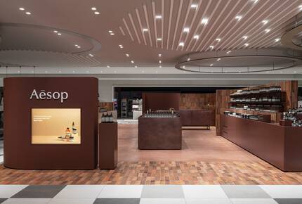 The store’s long straight lines are softened with rounded corners, one of which is inset with a generous seating area that invites commuters to catch their breath, forget about the surrounding din and take in the tranquil and sensorially indulgent setting. They may then wash and moisturise their hands at the large basins in the middle of the space: covered in oxidised copper, these offer a moment of unexpected respite amid the bustling train station. Accentuating the curves that draw the eye, an earthy palette rounds out the welcome into this sanctuary of tradition.