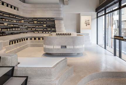 The first impression of Aesop Hiroshima is shaped by its steps—both the functional flight that leads to its second storey, and the successions of gently curving gangi that make up the floor, the walls, the benches, the counter. It is a feature that invites the visitor to be immersed in a space informed by water—namely, the rivers of this delta city. The distributaries of the Ota river that meander through Hiroshima in vivifying tracts are as fundamental to the lives of locals as the iron that has driven and sustained their city since its founding. Longstanding design collaborator SIMPLICITY drew deeply upon this geographical context and industrial history to create a store that honours human ingenuity as much as it does topography.