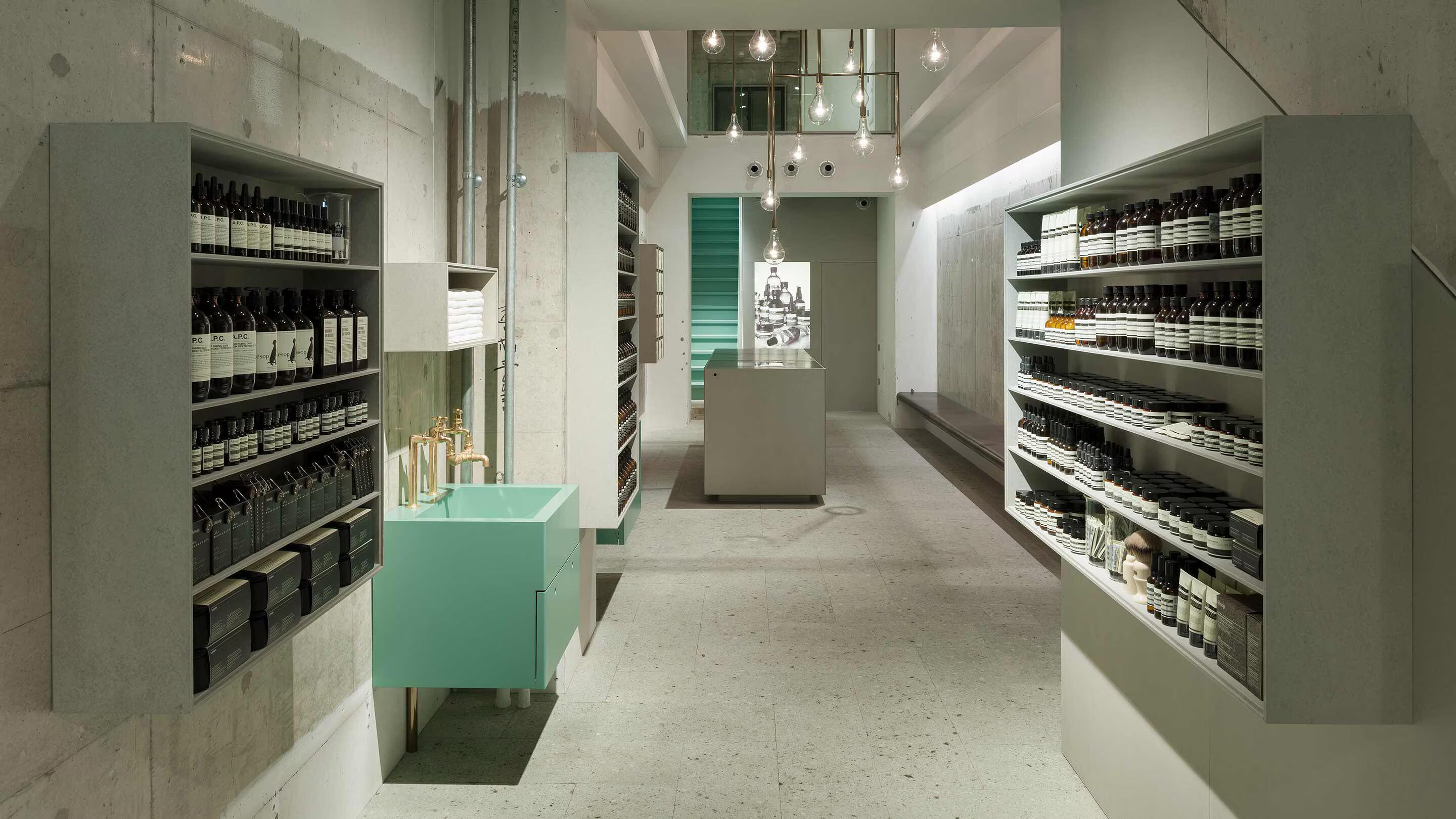 The elongated, narrow interior progresses from product display at the front to demonstration sinks midway, to the sales counter through to the rear, where a leather-covered seating bench invites a moment of repose and a staircase leads to a first-floor gallery space. Continuity is effected by pendant lights traditionally used on squid-fishing boats, and by green accents throughout.