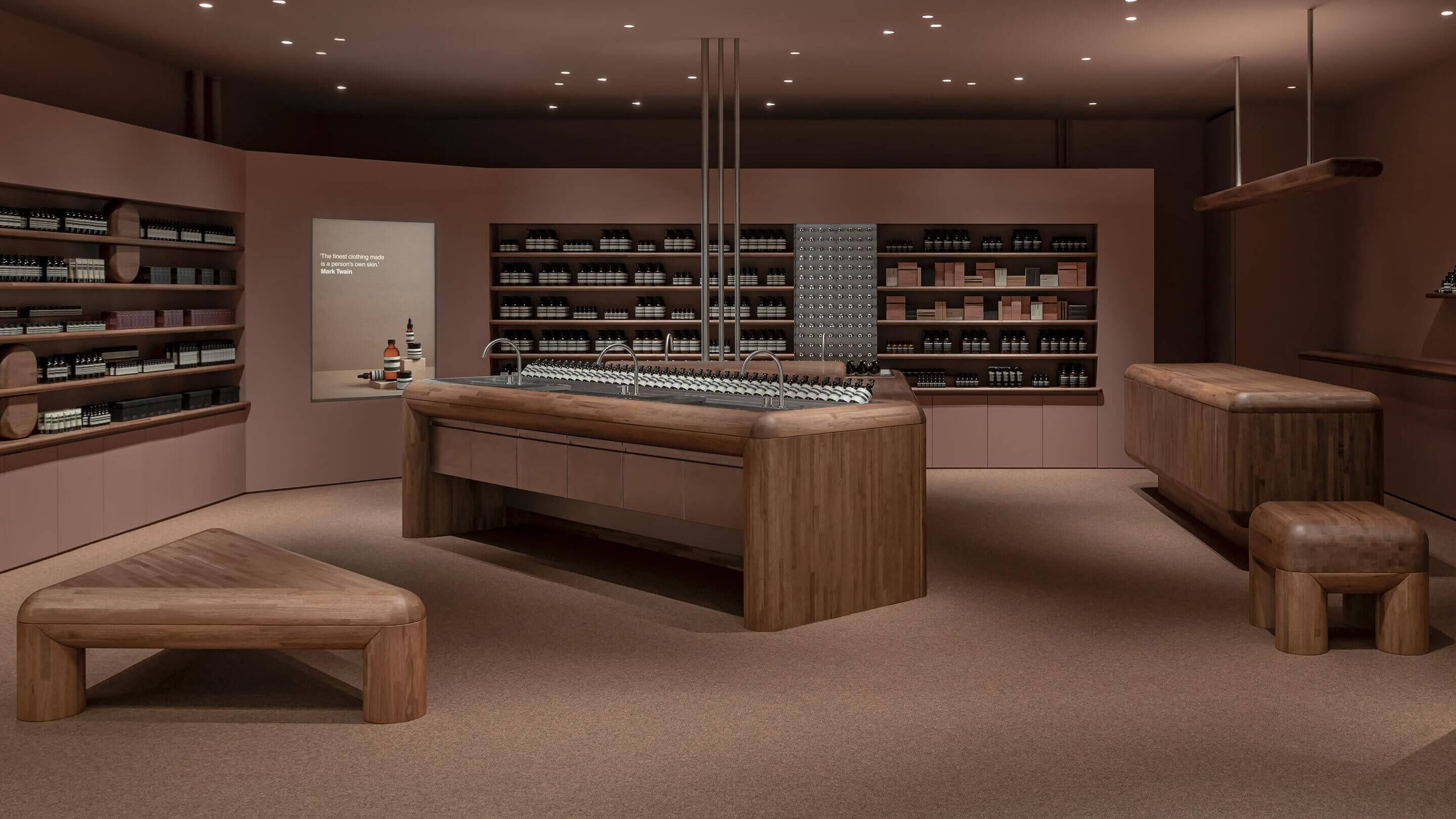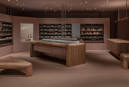 Working with local manufacturer Karimoku Furniture, Japanese Chestnut was crafted to express volume—rounded edges and chunky legs contribute a sculptural mass that grounds the spatial experience. Coffee-hued cashmere carpet underfoot enhances the comforting sensation one gets when entering the store. Dusky pink walls harmonise with the tones of the timber while stainless steel basins glisten from the centre.