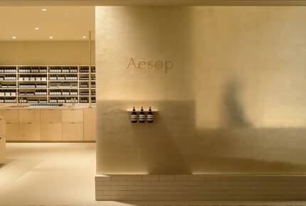Aesop Lucua in Osaka, designed by Schemata Architects, is a calm, warm response to the retail centre. From a distance, through the façade’s luminous fibreglass, the space appears as a soft beige mirage. Once inside, the variety of materials and textures comes into focus.