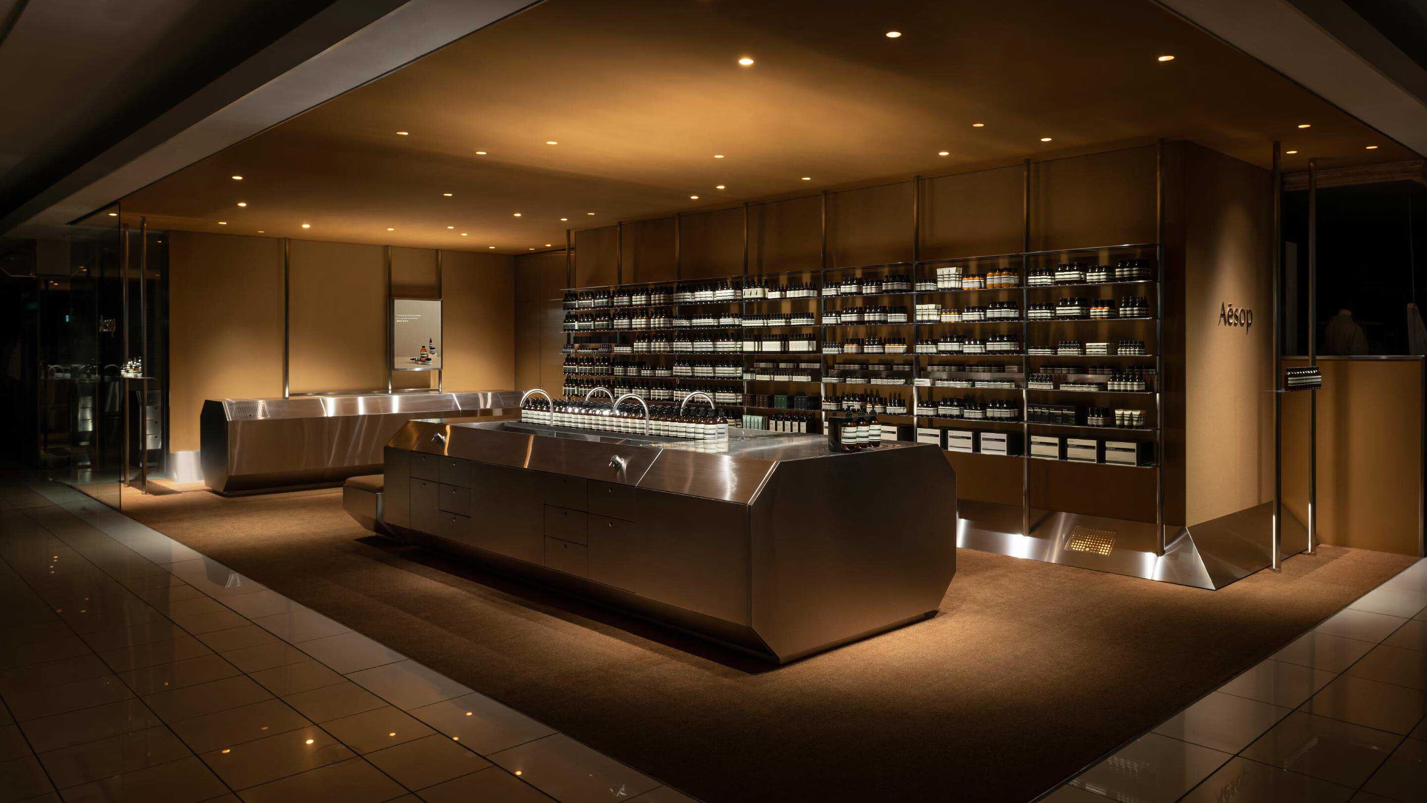 At Aesop Lumine Omiya, our in-house design department lined surfaces with fabric panels and a soft coir floor—the latter absorbing the sounds of the retail centre’s passing footsteps. Steel fixtures and angled kick-plates recall the geometries of locomotive travel and allow the visitor to stand just that much closer to the basin.