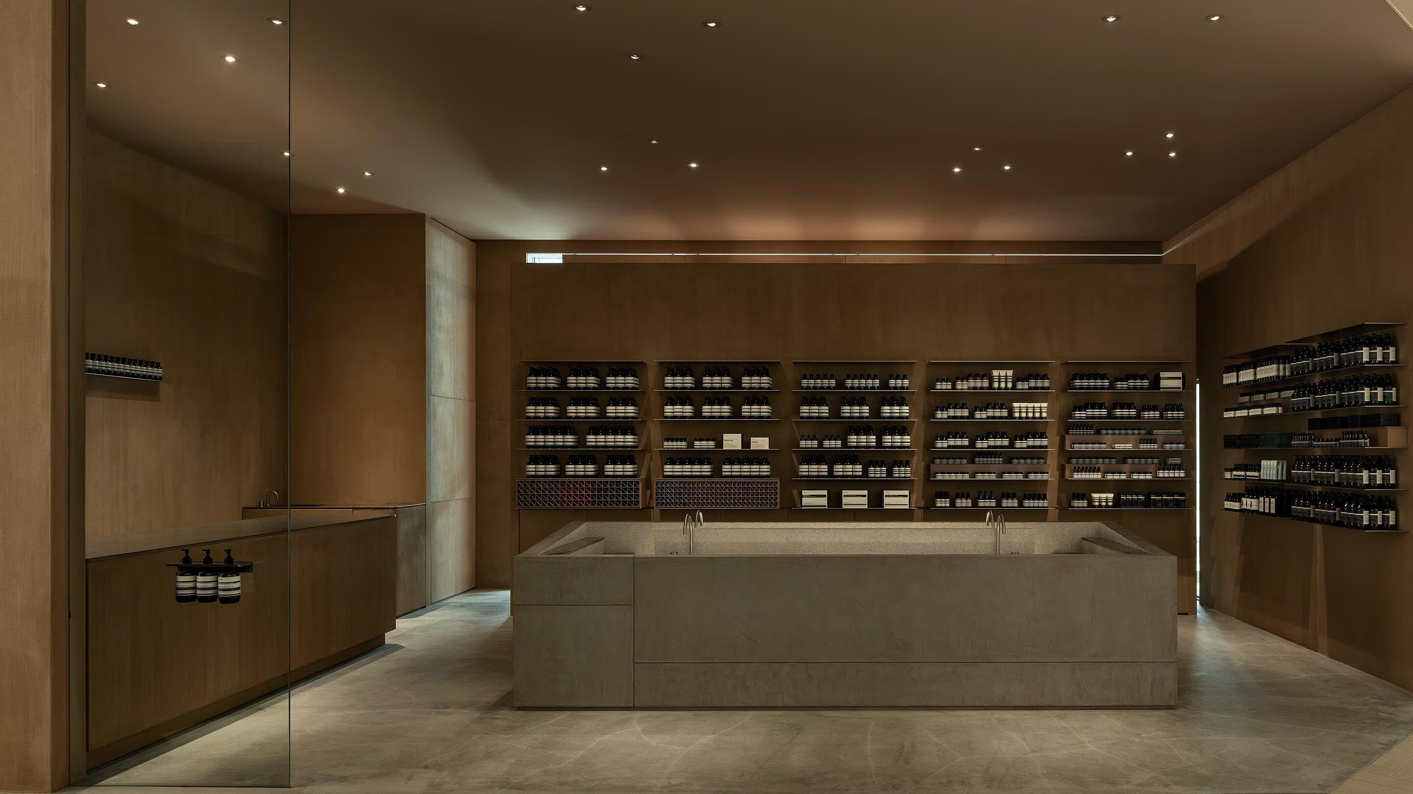 Designed in collaboration with MLKK, Aesop Scramble Square recalls the nearby Shibuya River with a deep infinity well at the centre of the store.
