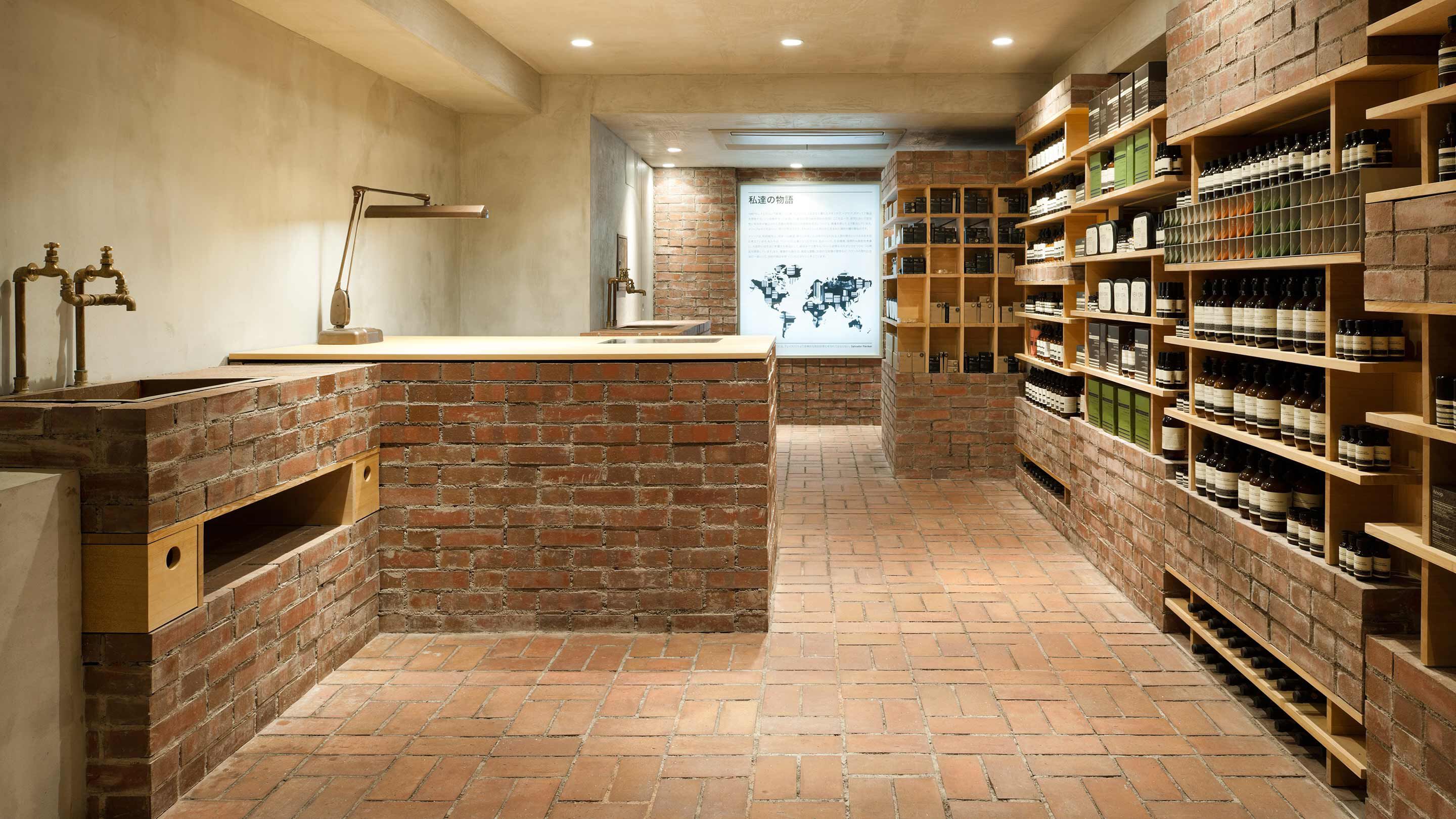 Red brick was chosen as the primary material, in a gesture to the street’s epithet—Red Brick Street—and to explore the possibilities of a utilitarian material uncommon in Japan. The bent copper demonstration sink pays homage to an era when quality plumbing was treated with greater reverence.