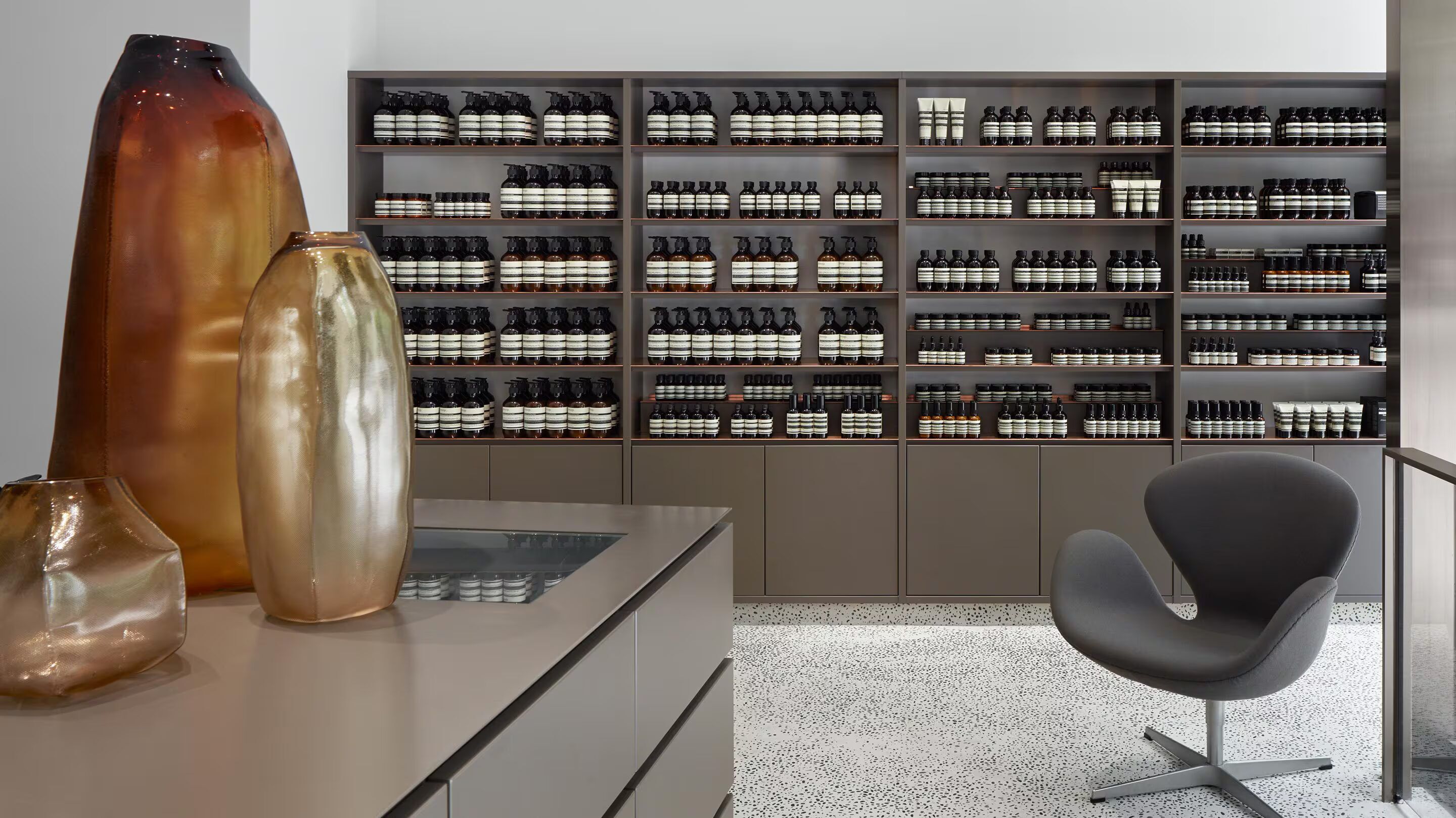 Pebble-wash flooring crafted subtly blurs distinctions between interior and exterior and emphasises a material agenda of externality, along with sink and product display shelving marked by the use of copper—whose warmth and softness complements the hue of coated steel countertops.