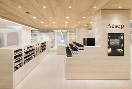 The wall-less space is constructed chiefly from limestone. This pale, tactile material is used for flooring, pillars and fixtures, which appear to be sculpted from a single mass. The joints are set in a three-dimensional grid, with 108 pieces at each position. A large sink unit is combined with a pillar that provides tiered display shelving. Recessed overhead lights and feature backlighting effect gentle illumination throughout the interior.