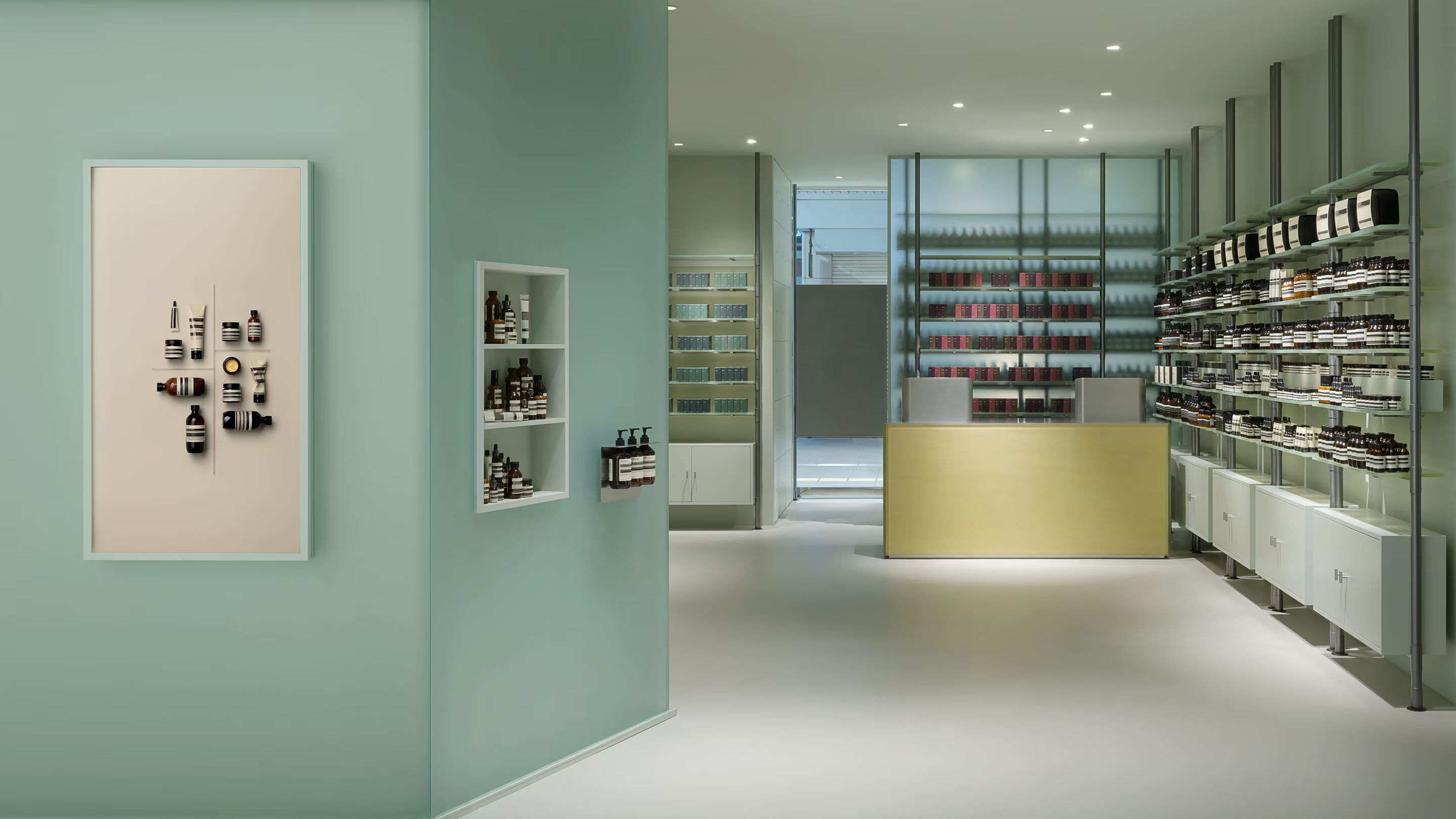 Aesop Lumine Yokohama takes its inspiration from the nearby port around which the city first flourished. The space evokes a dockyard at dawn, where industrial materials are awash with marine hues and translucent surfaces reflect the surrounding waters of Tokyo Bay.
