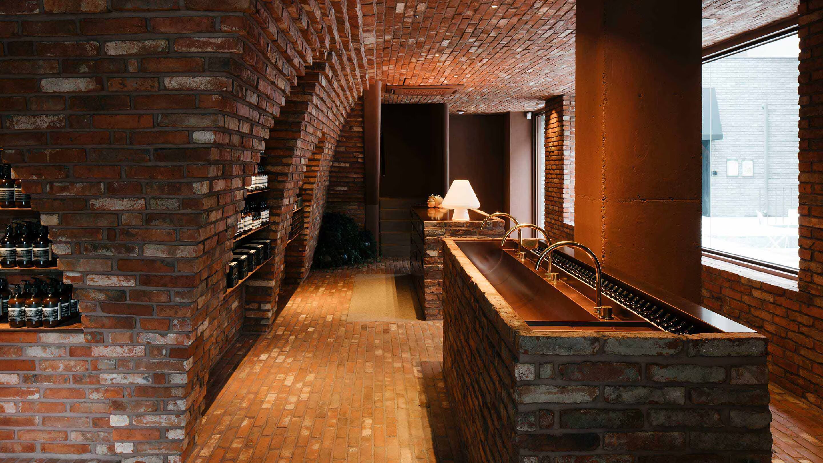 Viewed from the street, Aesop Hannam Sounds is redolent of a cloister; an inviting space that retains a sense of the mysterious, its windows offering a glimpse of the warmth inside. Upon entry, a welcoming interior is revealed, hewn from brick. Two commanding volumes—a demonstration sink and point-of-sale—are centrally positioned, a material extension of the brick flooring and walls.