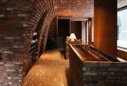 Products are displayed in arched niches whose rounded brick forms recall mangdaengi gama, traditional chambered kiln. Copper shelving and detailing stand in pleasing juxtaposition to the predominantly earthen textural palette. A stairwell leads to a second floor; here, the treatment room, lounge and back-of-house area reprise the honeyed tones of the retail space below, while the outdoor terrace offers a place for repose.