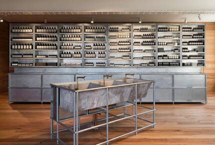 As an ode to the domestic ritual of washing—integral to our philosophy—a large concrete tub sits as the centrepiece of the interior. The shelving surfaces are reminiscent of oven trays, alluding to the site’s original use as a commercial bakery.