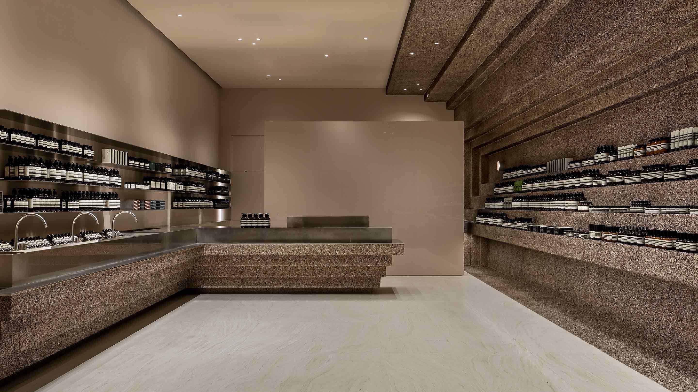 店舖門口設有台階,賦予店門低調謙和的家居感。店內的分層設計利用水平和垂直平面,構建出體驗和思考Aesop產品的空間。凸起部分延伸至牆壁和天花板,呈現出倒金字塔式的造型。