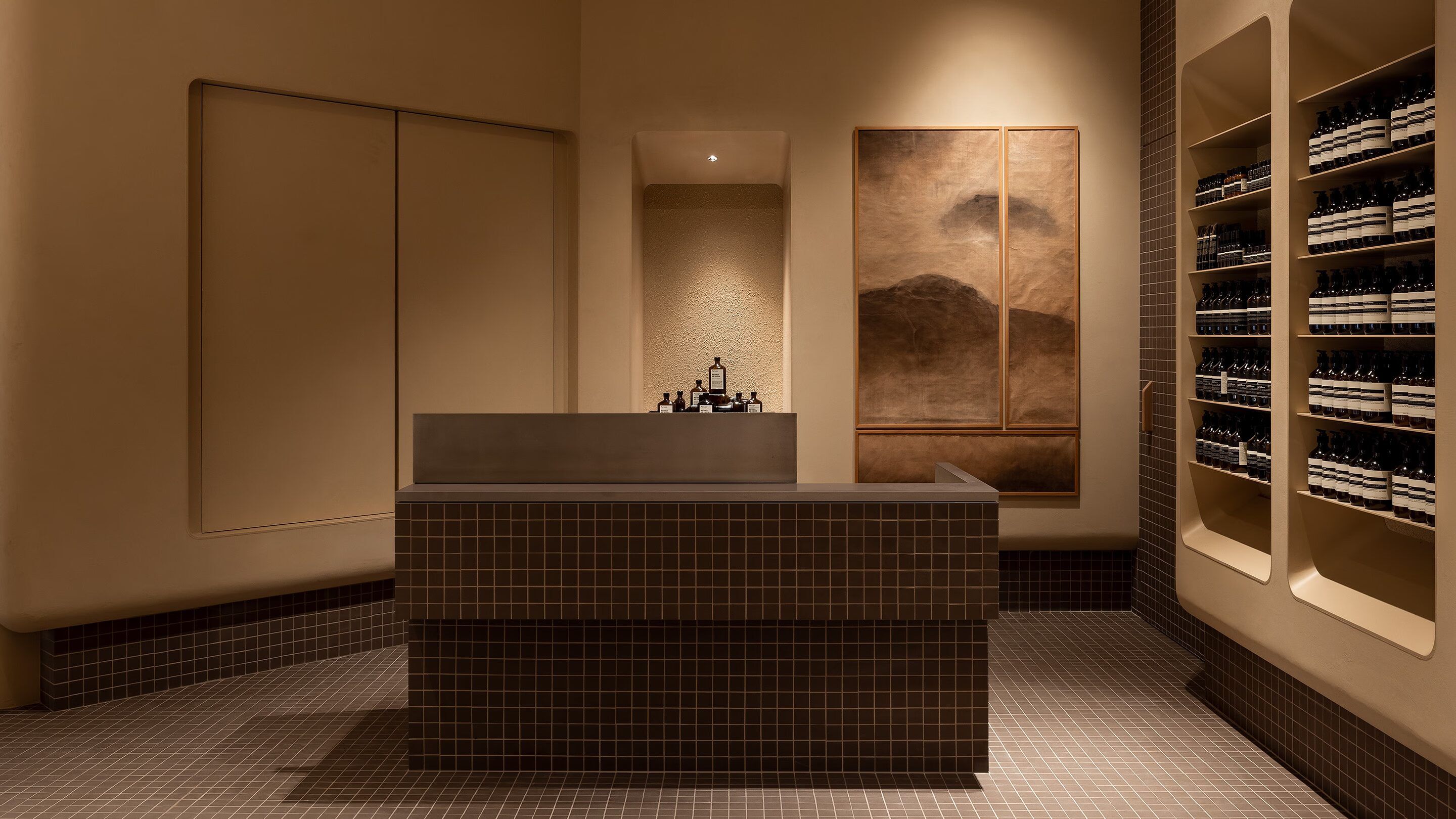 店舖外牆的玻璃櫥窗展示著引人入勝的 Aesop 精選配方,這一系列產品沐浴在獨家定制由銹鋼製成的燈光之中,彷彿向人們遞上溫暖的邀請,吸引訪客踏入空間。而在店鋪內部,映入眼簾的則是一座矩形懸浮水槽,以及暗棕色霧面瓷磚等設計元素,旨在向 1930 年代台灣工廠的建築致敬。