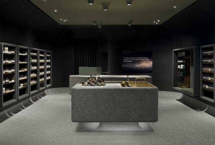 店內的整體式櫃檯上有可供三人同時使用的天然黃銅水槽。試用品放置在陷入檯面的斜槽內,這一設計與整個空間的凹陷式風格相呼應。墻上裝有用毛氈包裹的擱架,擱架向外延伸,化為形如遊廊的三人座位。頂燈與天花板融為一體,位於水槽和櫃檯上方,營造出虛實相生的奇妙效果。