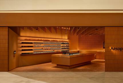 Aesop 最新 LaLaport 南港店的設計,便從這段昔日歷史記憶中汲取靈感。外牆與後方主牆,以特選的方形紅陶磚排列出一格一線,透過整齊的序列感,呼應過往磚窯堆砌的工藝史話;天花板也延續這樣的節奏,懸掛著尺寸一致的染木,構成一片充滿層次與結構感的網格天篷。此為Aesop台灣首次在天花板設計採用大量橫縱交錯木條排列的手法,更具層次與結構感,也是這間店鋪設計中最具挑戰性與複雜的地方。交錯的木條創造自然流線感,平衡牆面磚瓦的剛硬,也略微壓低了空間高度,營造出一種更親密、內斂的氛圍。中央展示檯以上釉陶磚製成,觸感清涼而溫潤,帶出不同材質的層次也呼應南港紅磚的代表色。水槽則採用不鏽鋼材質,顧客可於此親身體驗 Aesop 專為肌膚、秀髮、身體與家居悉心研發的全系列產品。若想多停留片刻,角落設有內嵌式沙發,適合歇息,在這座由紅磚陶土築起的感官庇護所中,安然感受寧靜的秩序與設計的溫度。