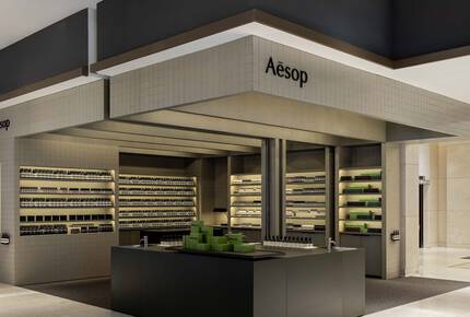 Aesop新光三越新天地A8 店也借鑒了台灣的茶室設計,空氣中彌漫著撫慰人心的舒緩氛圍,整體展現了柔和且迷人的色調,其靈感汲取自溫暖熱茶的意象。空間中的產品層架,旨在呼應傳統茶道托盤的優雅質感,其中由回收茶葉與樹脂混合所製成的部分則精心融合了大自然及工藝文化,也持續在店鋪設計上帶入品牌一貫的永續元素。