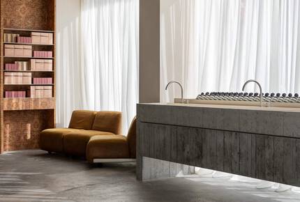 長型水槽與內面為店舖空間的視覺核心,先在木模內以清水混凝土灌漿成形,全程在店內以手工打造而成,其粗糙的水泥表面保留了製造過程的獨特痕跡與天然木紋印記,與現代感金屬鐵件形成強烈美學對比。樟木樹瘤紋路的內品層架,彷彿與水槽表面木的質紋理互相呼應,在空間中彼此對話。